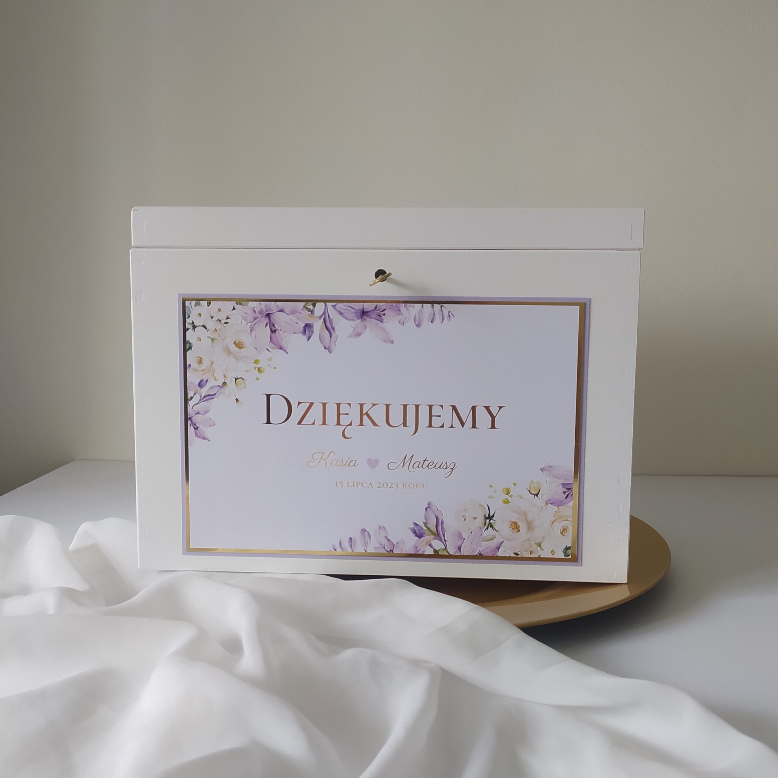 Cena zawiera drewniane białe pudełko na koperty, z naklejoną na przodzie spersonalizowaną etykietą. Czcionki, kolorystykę możemy dopasować wg Waszych preferencji.