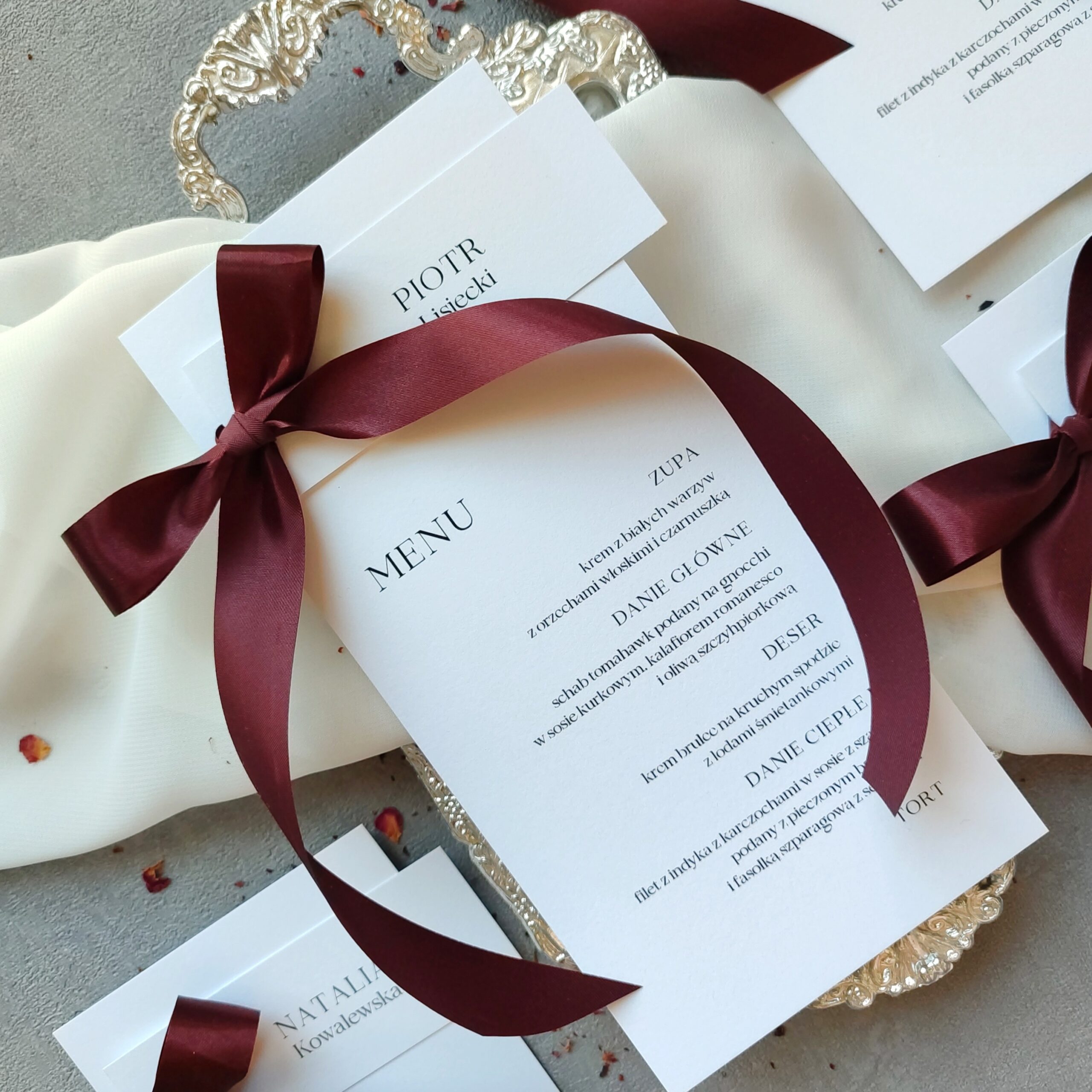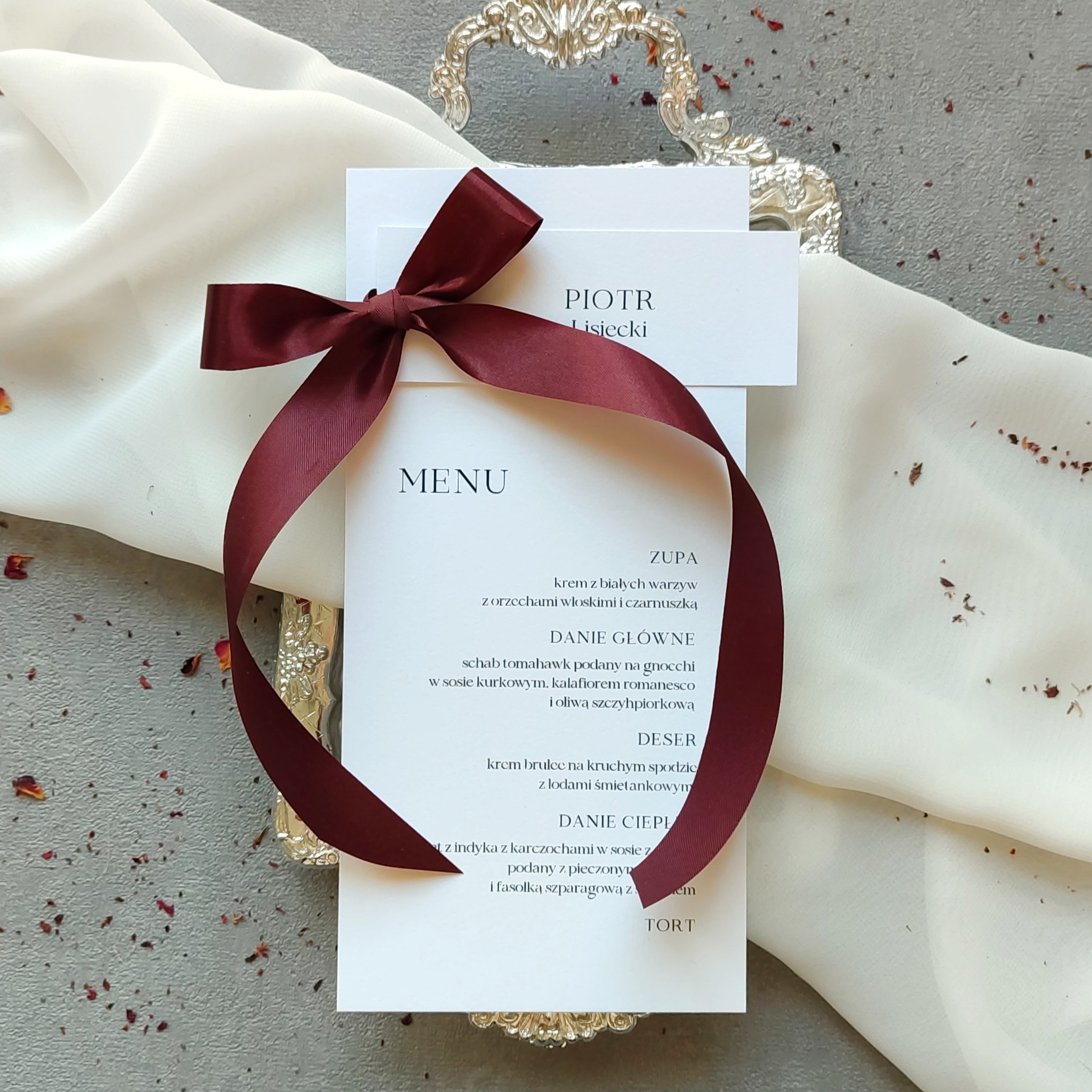 Cena zawiera zestaw menu klasyczne, do położenia na talerzyku lub serwetce, z dołączoną winietką umieszczoną na górze menu, złączoną kokardą ze wstążki satynowej. Układ tekstu, czcionki, kolorystykę możemy dopasować wg Waszych preferencji.