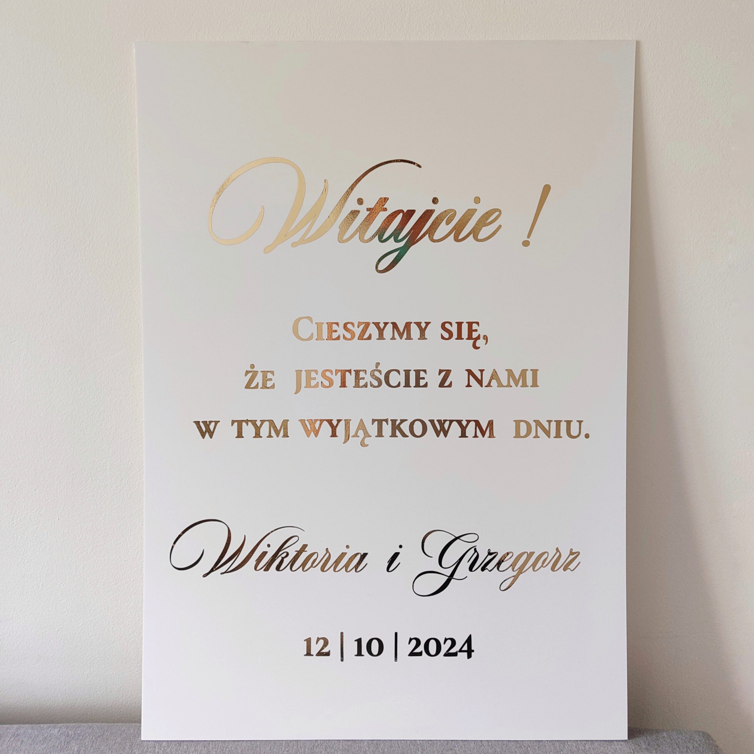 Elegancka i trwała tablica powitalna wykonana ze sztywnej płyty PVC ze złotymi lustrzanymi napisami. Idealna do ustawienia przy wejściu na salę weselną lub przy stole powitalnym. Możliwość pełnej personalizacji sprawiają, że dopasujesz go do stylu swojego przyjęcia. Dzięki solidnemu materiałowi tablica jest lekka, łatwa w przenoszeniu i odporna na uszkodzenia.
