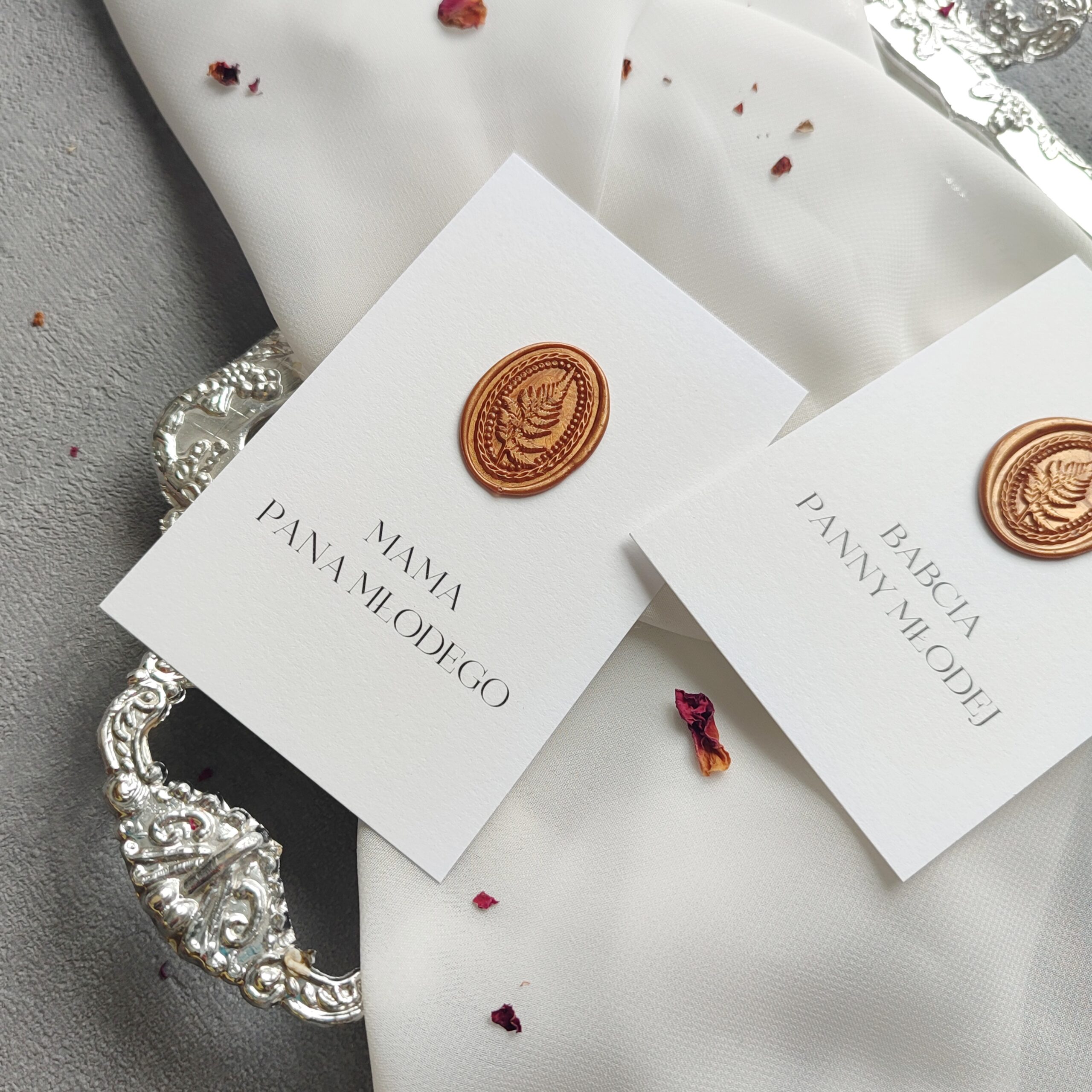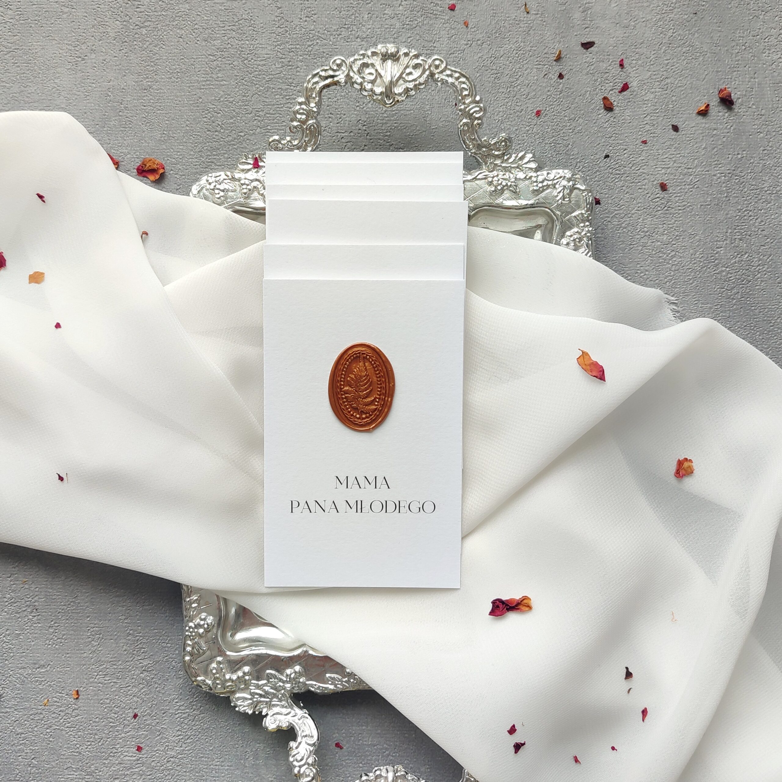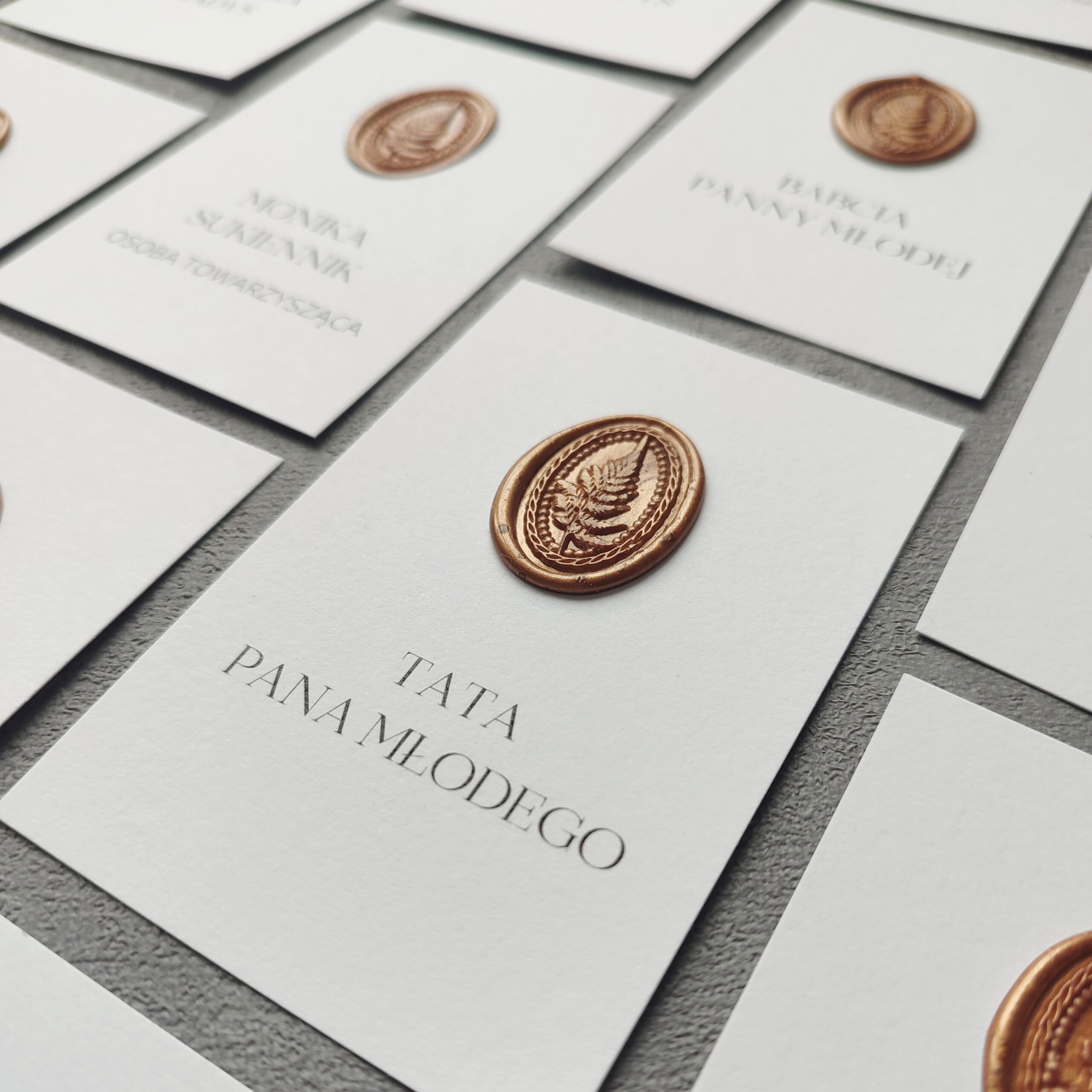 Winietki to elegancki detal, który w subtelny sposób porządkuje przestrzeń przy stole i podkreśla uroczysty charakter przyjęcia. Starannie wykonane, dopasowane stylistycznie do pozostałej papeterii, stanowią harmonijne dopełnienie aranżacji. Delikatna typografia, wysokiej jakości papier i dbałość o każdy szczegół sprawiają, że winietki stają się nie tylko praktycznym elementem, ale także piękną ozdobą stołu.
