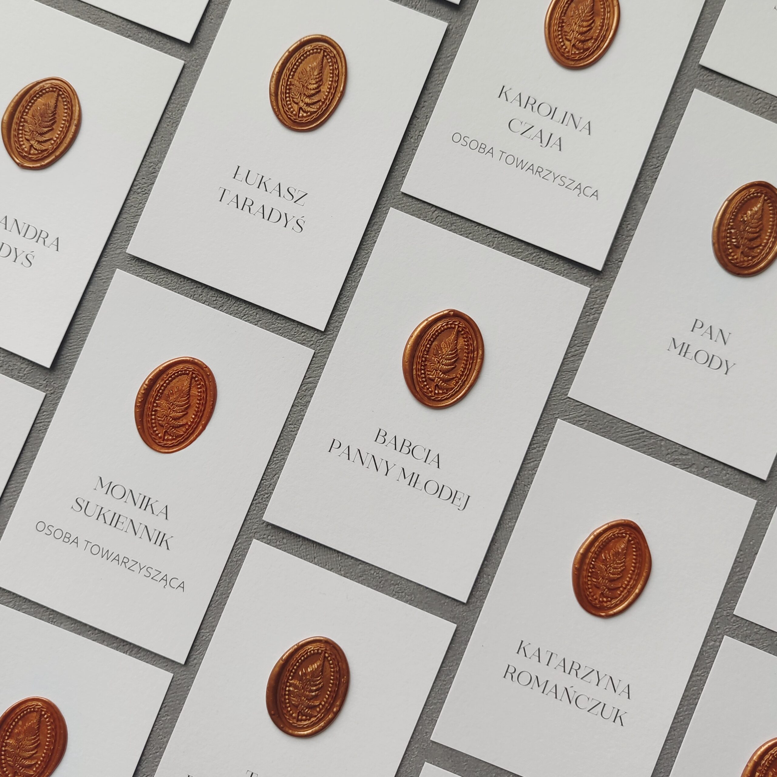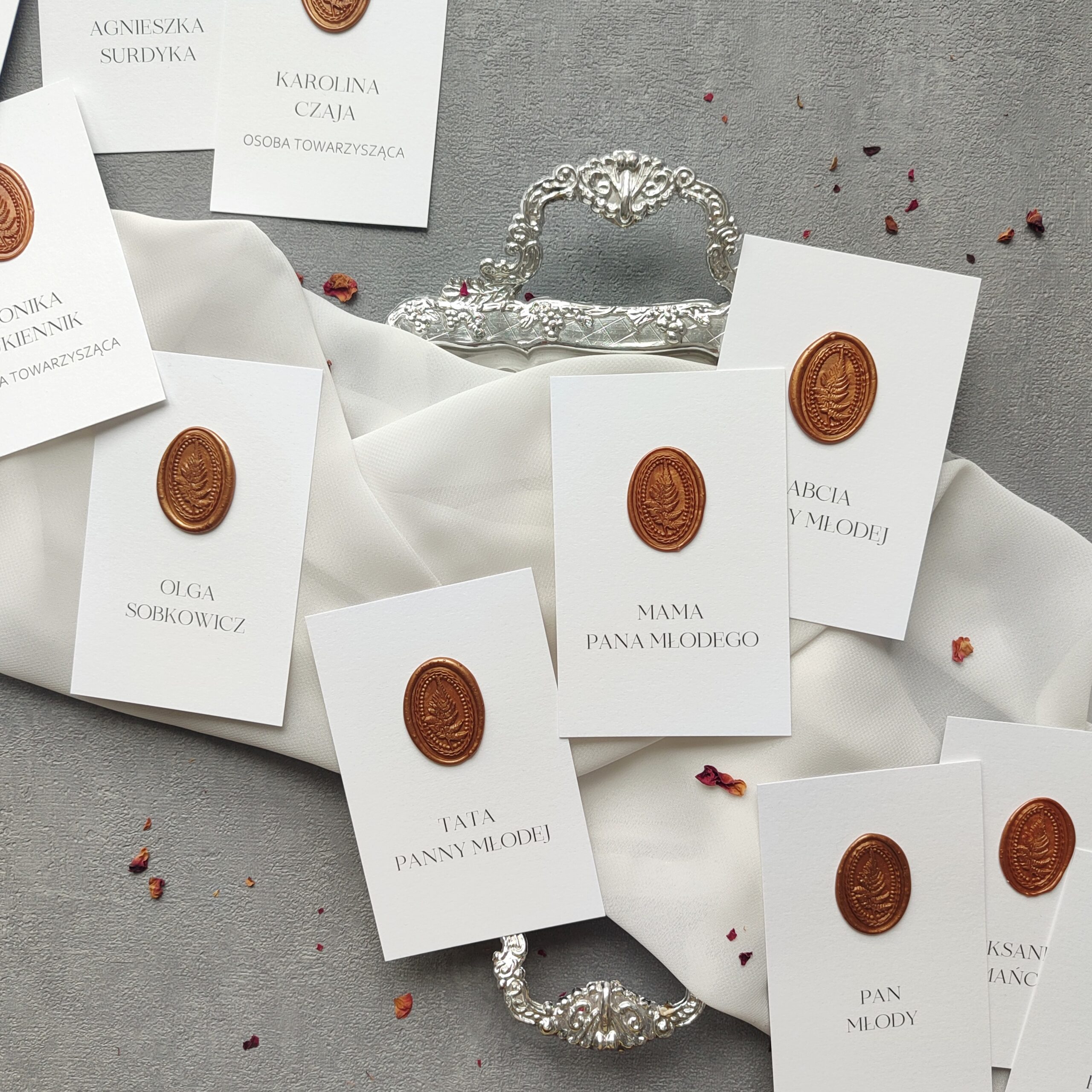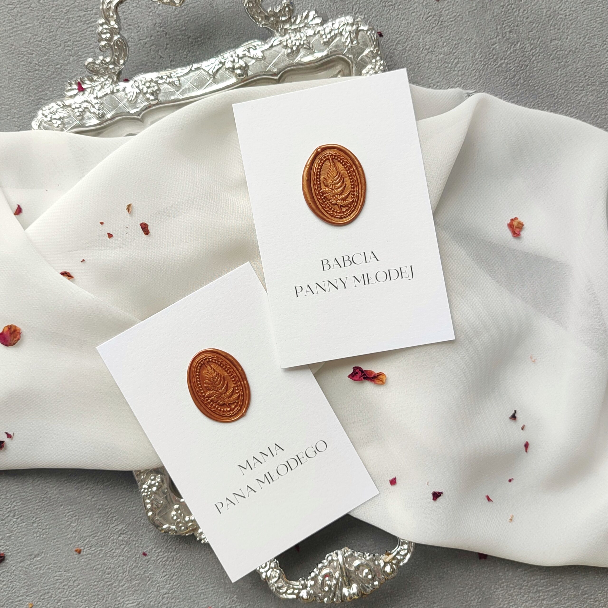 Winietki to elegancki detal, który w subtelny sposób porządkuje przestrzeń przy stole i podkreśla uroczysty charakter przyjęcia. Starannie wykonane, dopasowane stylistycznie do pozostałej papeterii, stanowią harmonijne dopełnienie aranżacji. Delikatna typografia, wysokiej jakości papier i dbałość o każdy szczegół sprawiają, że winietki stają się nie tylko praktycznym elementem, ale także piękną ozdobą stołu.