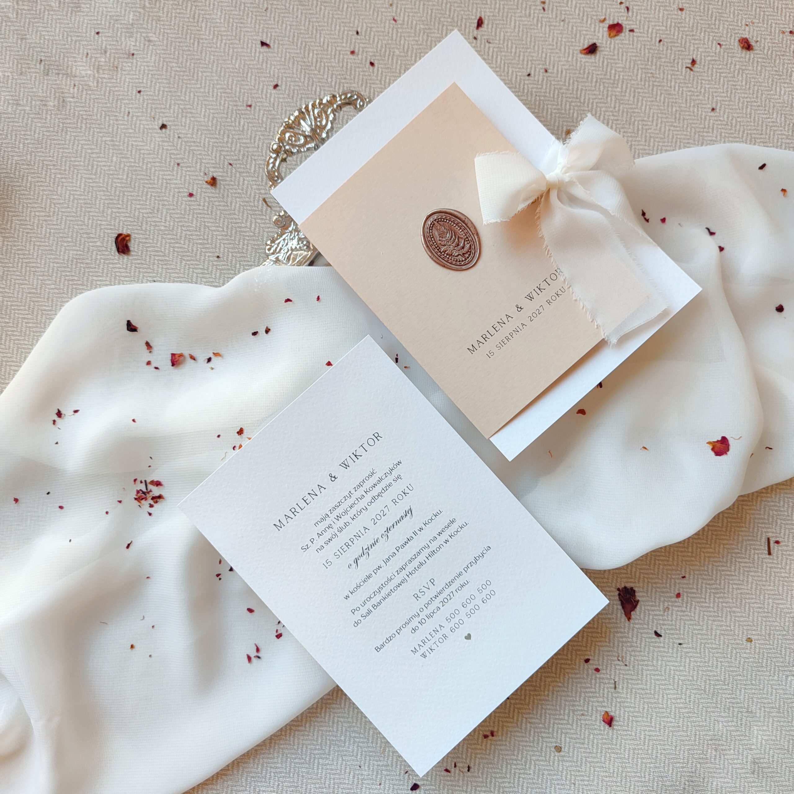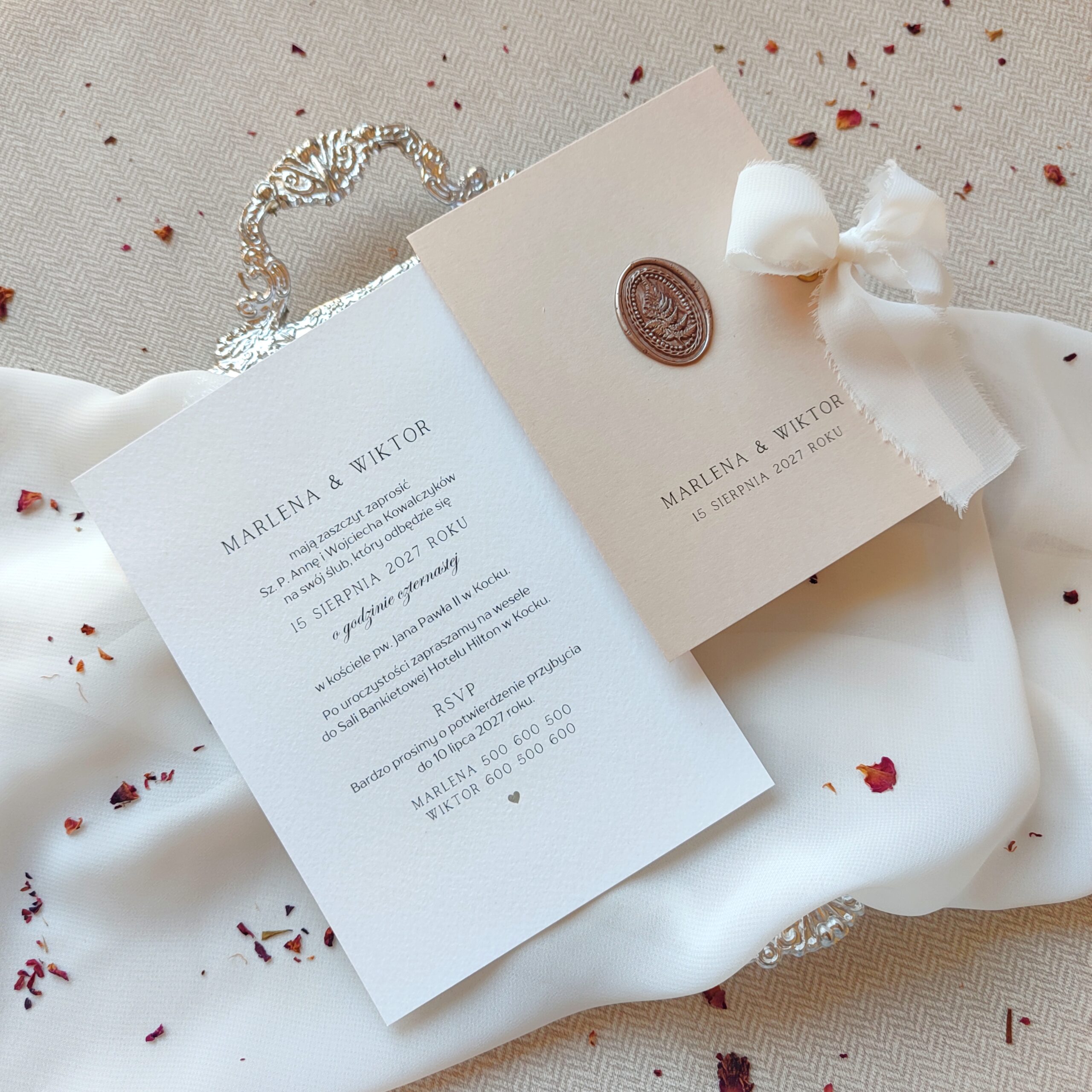 Pokazane zdjęcia produktu są przykładowym zestawem, zawierającym także elementy dodatkowe. Możesz zadecydować o efekcie końcowym zestawu zaproszenia, wybierając poszczególne opcje dodatkowe, które Cię interesują.