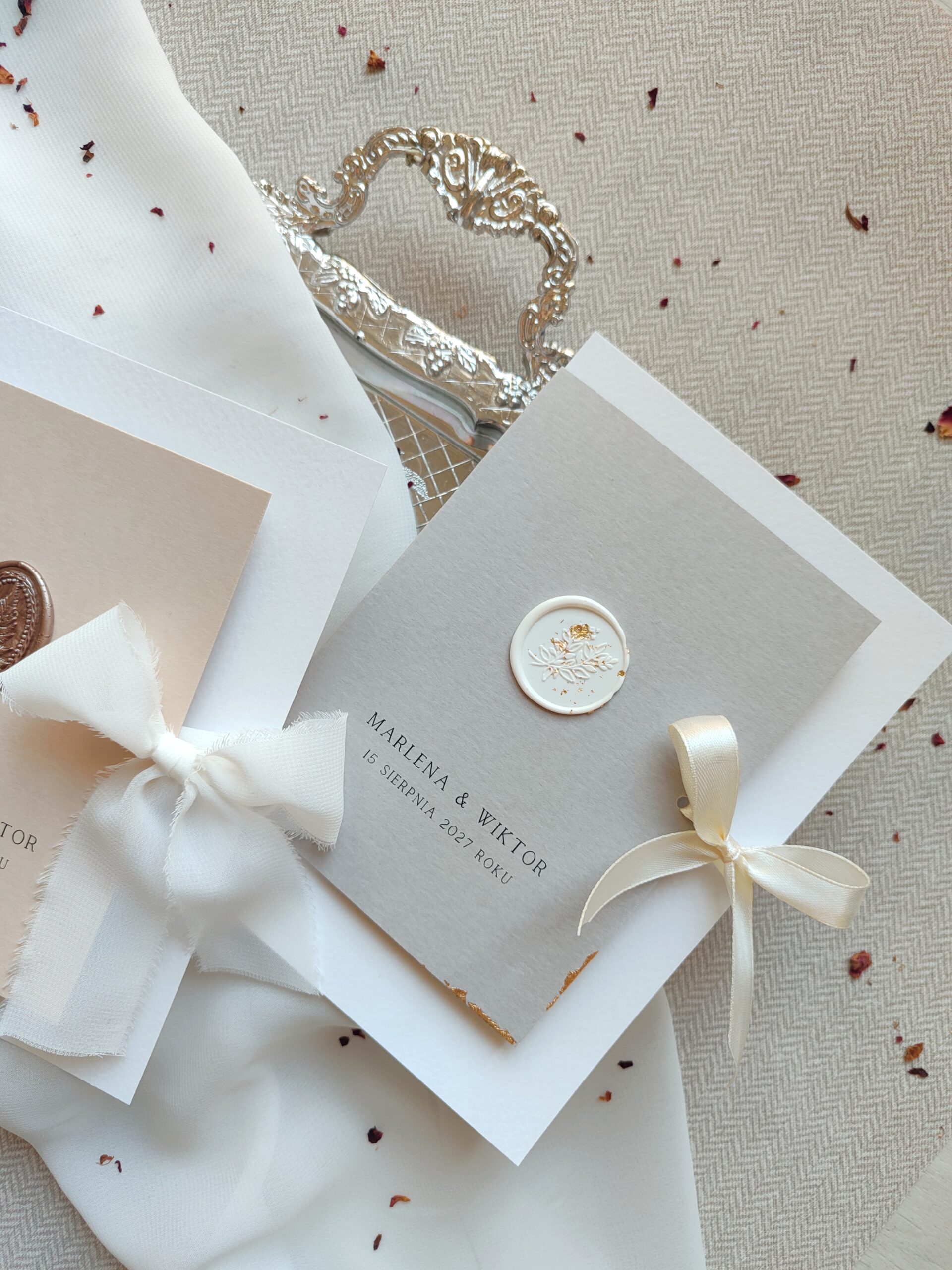 Do każdego modelu zaproszenia wykonujemy pozostałe elementy papeterii, np winietki, menu czy plan stołów, zachowując ten sam styl i jakość wykonania.