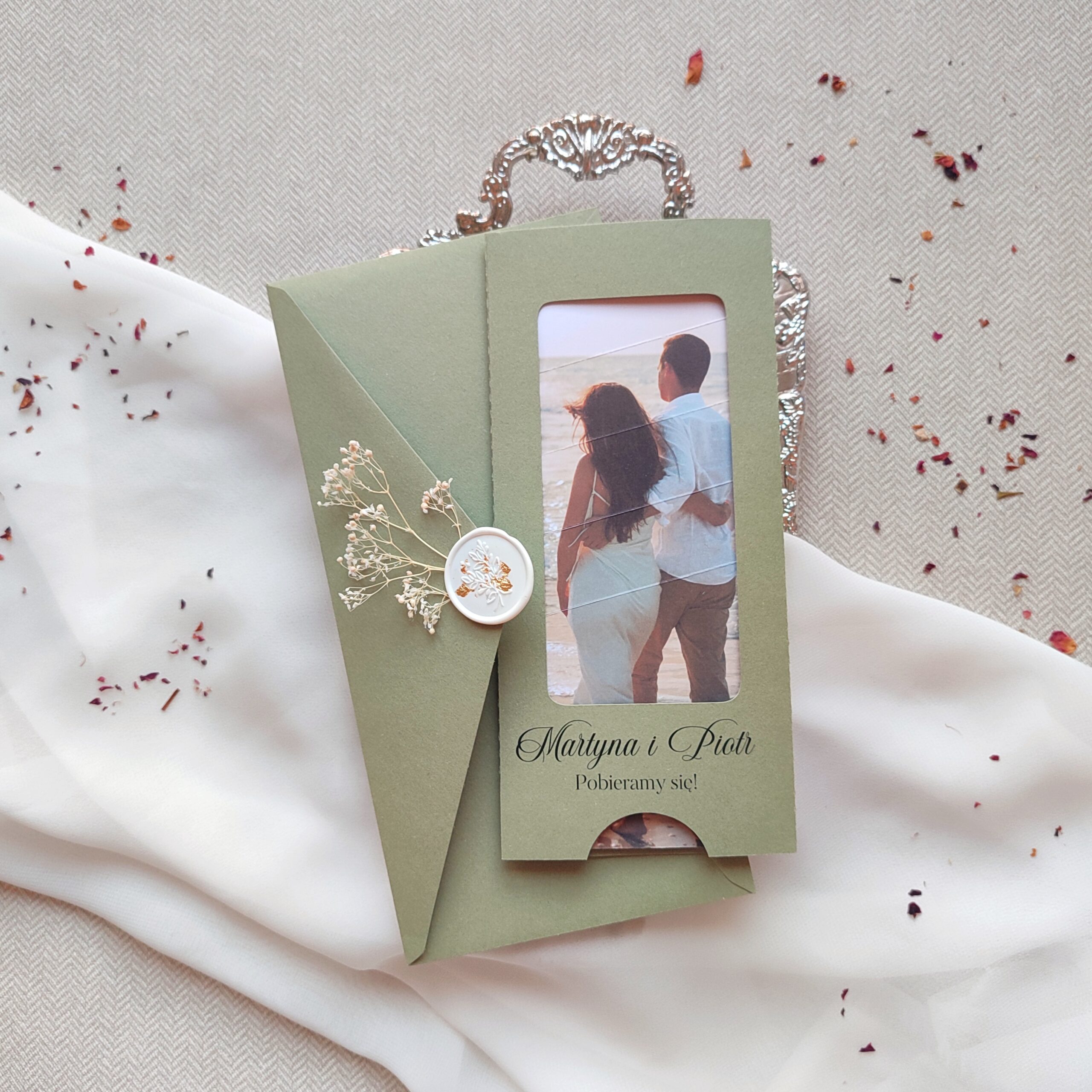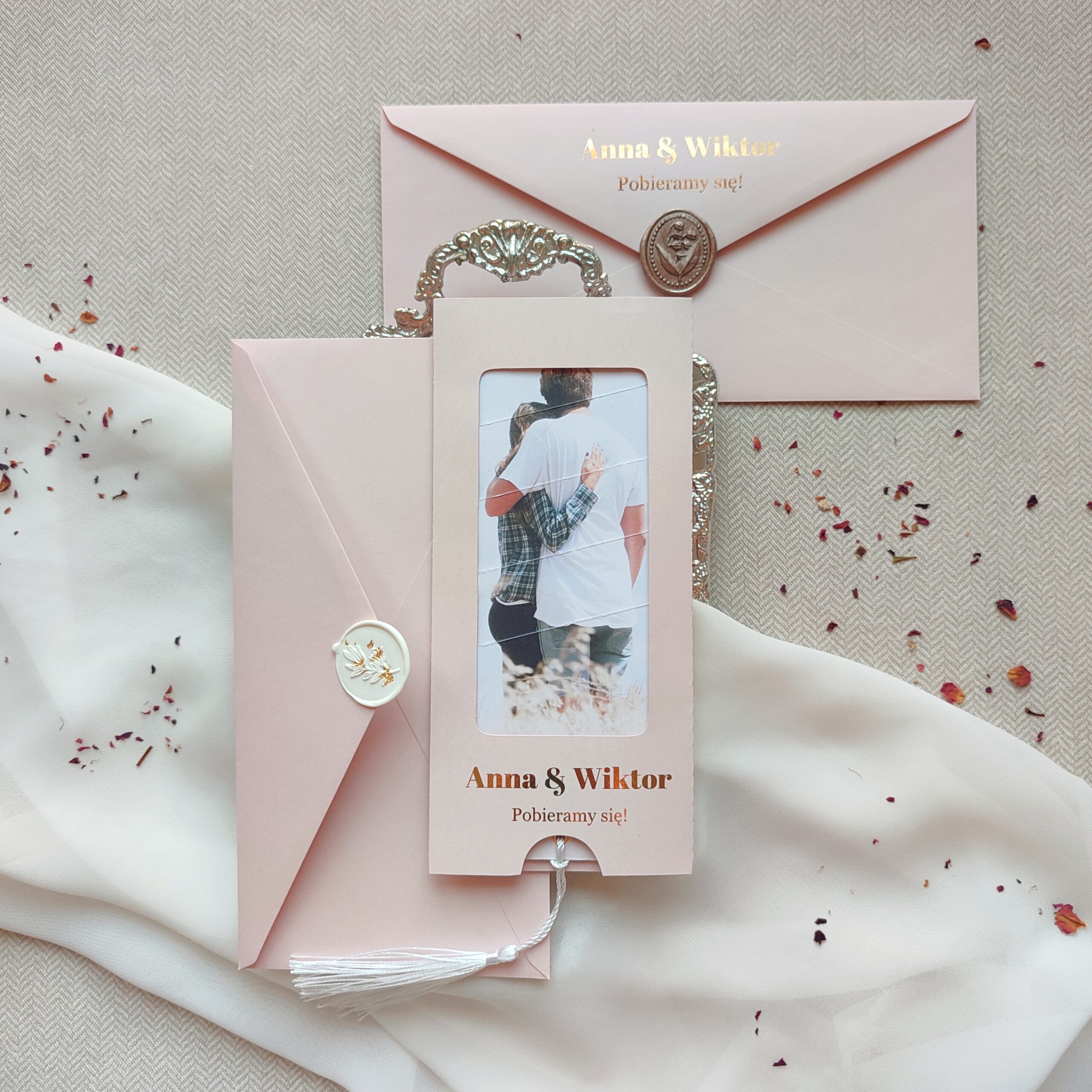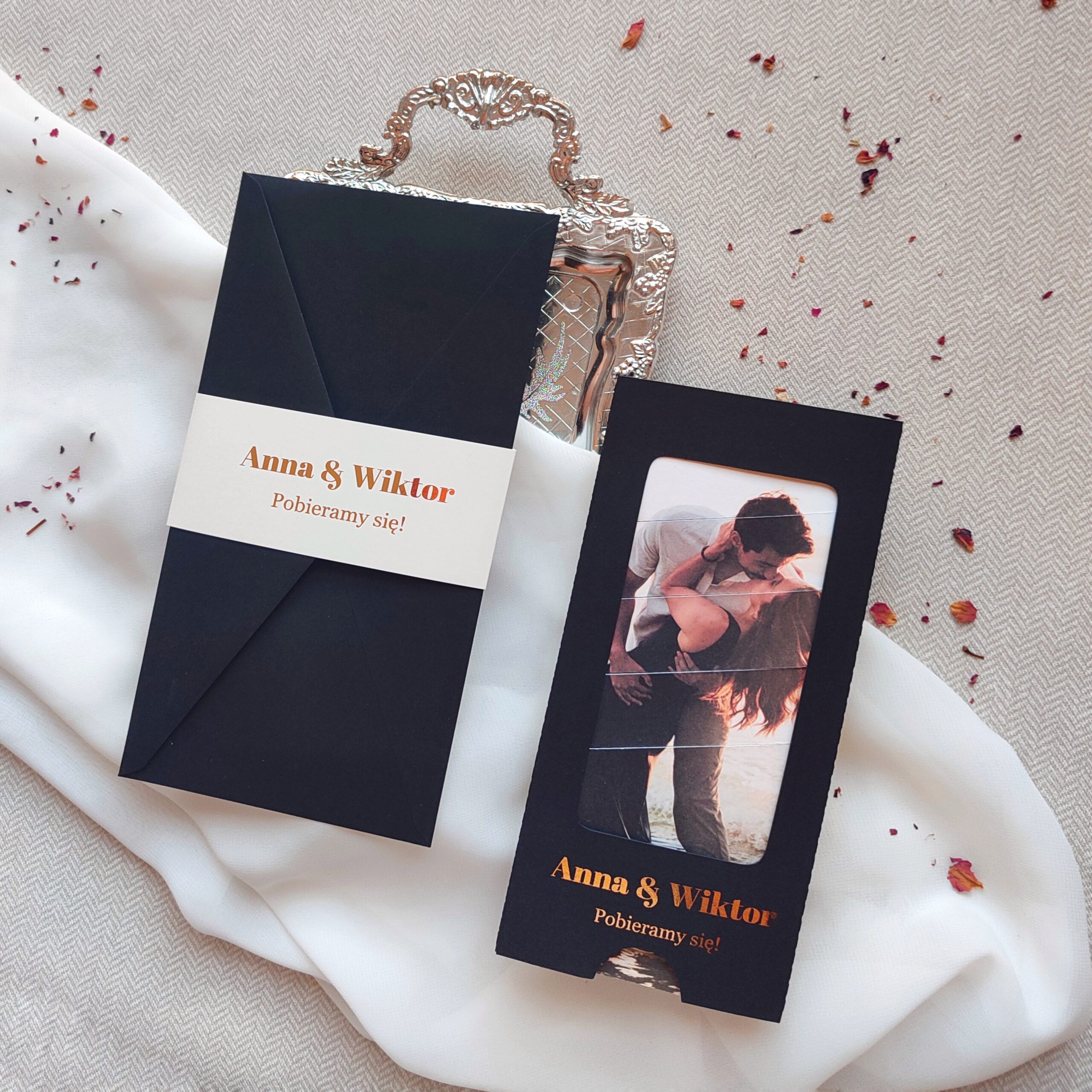 - zaproszenie w formie wysuwanej ze zdjęciem drukowanym na papierze satynowanym, w formacie 9×19,5 cm (+/- 0,5 cm)
