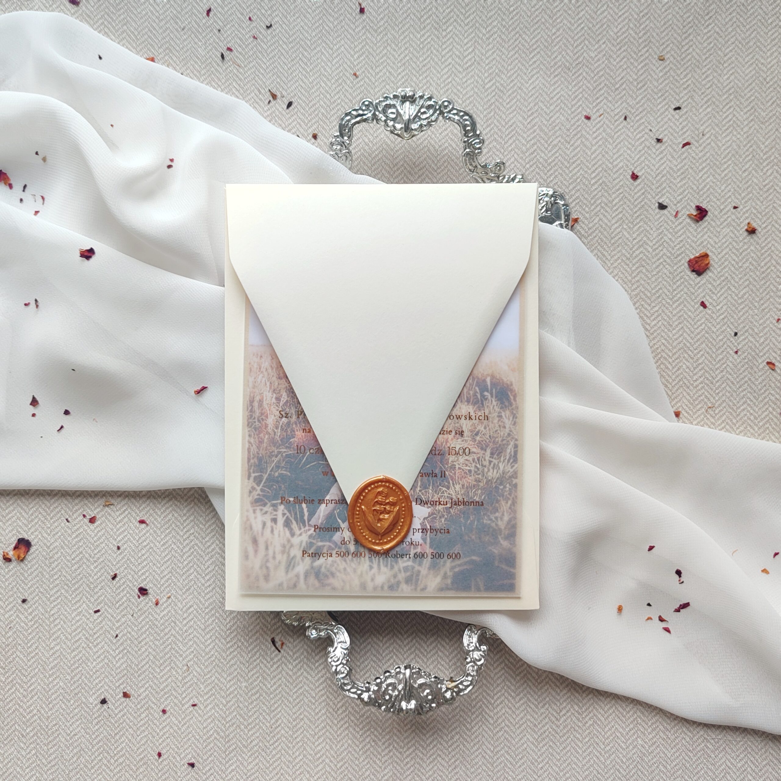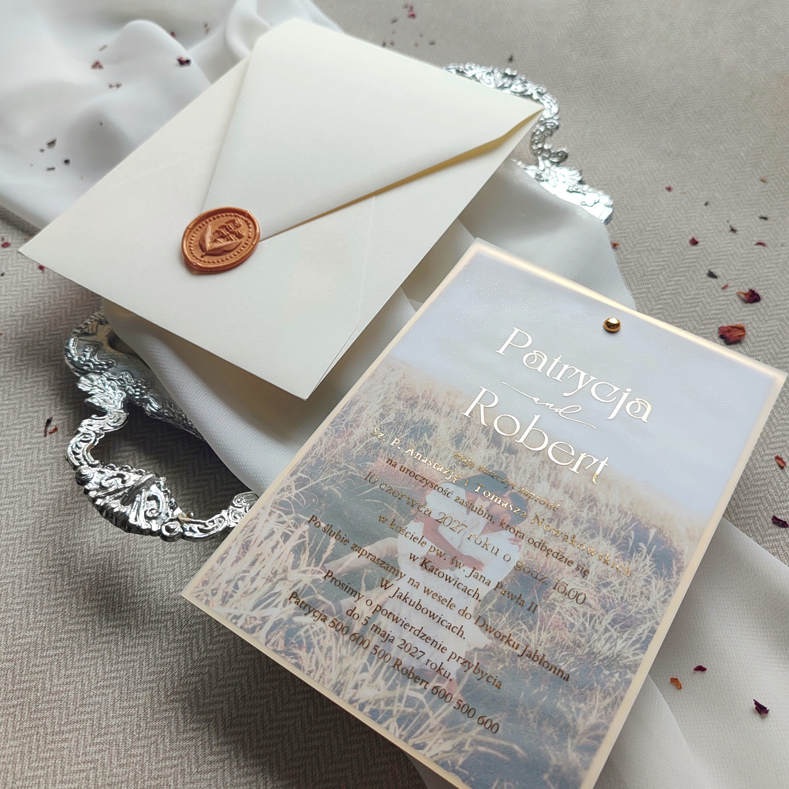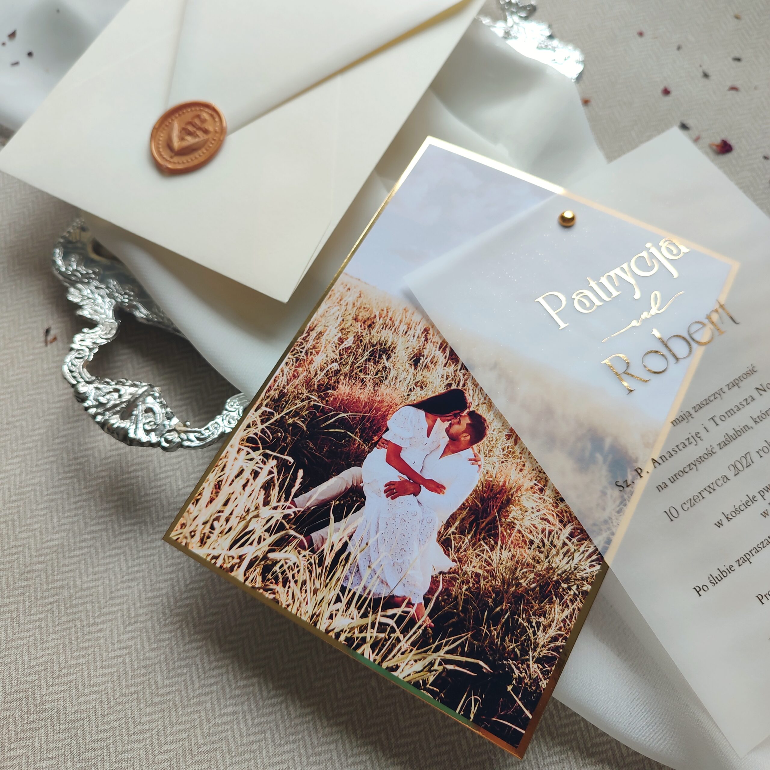 - karta z tekstem zaproszenia na kalce 90 g + złocenie tekstu